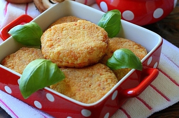 6. Сформировать небольшие котлеты и панировать их в кукурузной муке. Раскалить растительное масло, убавить огонь до среднего и обжарить котлеты с двух сторон до румяной корочки.
