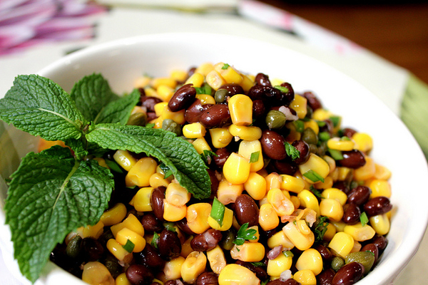 1. Фасоль промыть, добавить кукурузу, каперсы, мелко нарубленный чеснок и зелень.