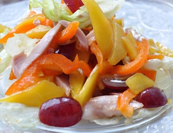 Рецепт легкого праздничного салата из копченой курицы, манго и винограда