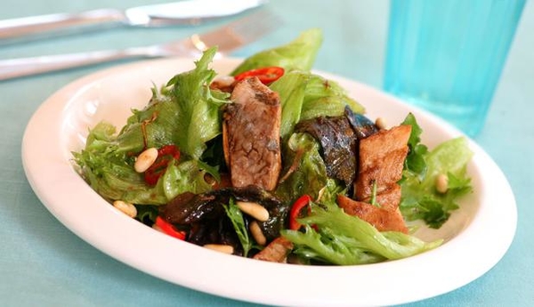 5. Листья салата и мяты смешать вместе. Сверху выложить теплую селедку и посыпать сверху кедровыми орехами.