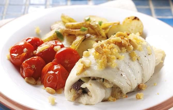 4. Другое филе положить на шпагат кожей вниз, смазать начинкой, прикрыть филе с надрезами, туго перевязать шпагатом, так чтобы он вошел в надрезы на рыбе, завернуть в пергамент и отправить в духовку на 40 минут при температуре 200 С.