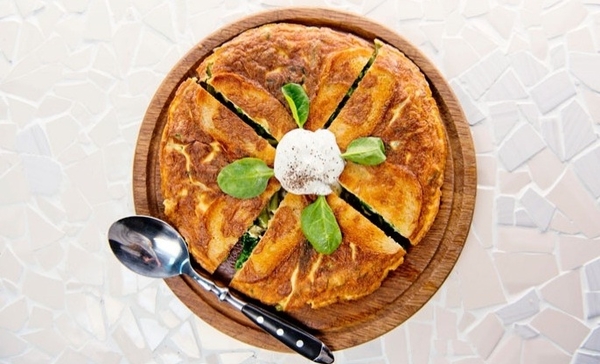 6. Готовую фриттату перевернуть на деревянную доску или тарелку и разрезать. Подавать со сметаной.