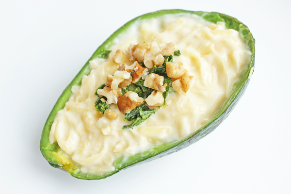 4. Чайной ложкой извлечь мякоть авокадо и наполнить получившуюся лодочку сырным салатом. Мякоть авокадо можно измельчить блендером, перемешать с сыром и наполнить другую половинку авокадо.