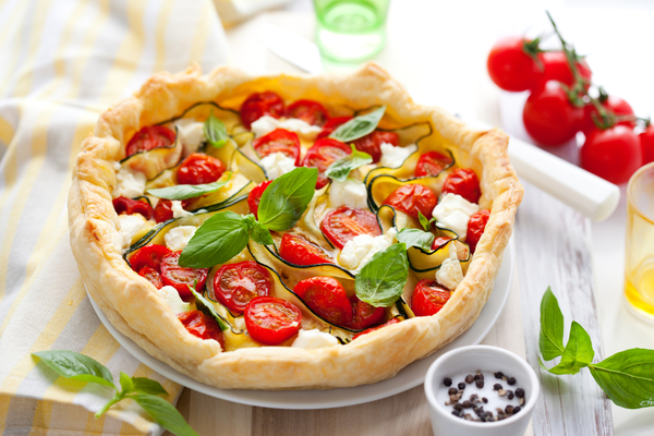 Пирог из дрожжевого слоеного теста с помидорами черри, цуккини и моцареллой – отличный вариант для летнего завтрака.