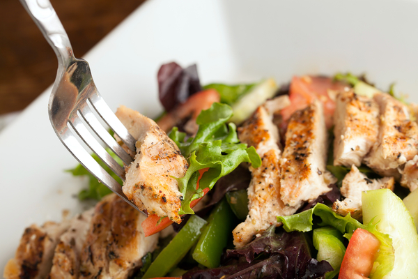 2. Мясо курицы гриль нарезать крупными ломтиками и добавить в салат. Приправить солью, перцем, заправить небольшим количеством оливкового масла и перемешать.