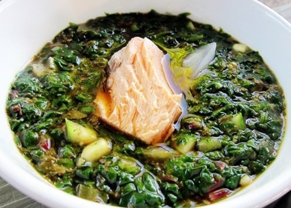 Рецепт холодного летнего супа из шпината и огурцов с вареной осетриной.