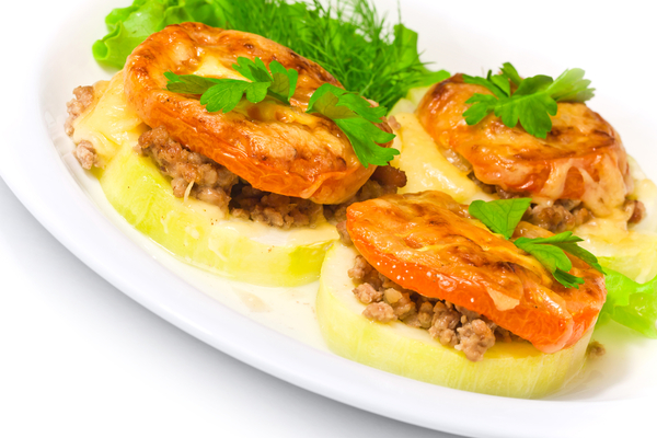 4. Противень застелить фольгой. Выложить кабачки, на каждый кружок поместить по столовой ложке фарша. Накрыть ломтиками помидоров, посыпать сухими итальянским травами и тертым сыром. Отправить в разогретую до 180 градусов духовку и запекать, пока сыр не расплавится.