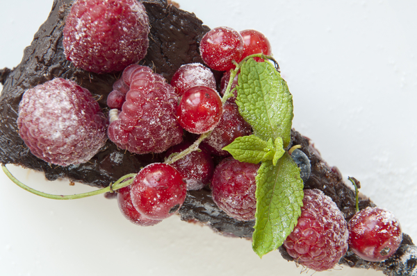 8. Перед подачей украсить торт свежими ягодами и листиками мяты, посыпать сахарной пудрой