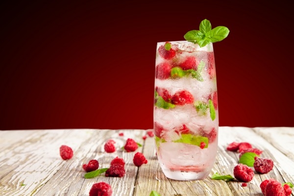 Вкусный освежающий коктейль из свежей малины с листьями мяты, лаймовым соком, сахарным сиропом и содовой