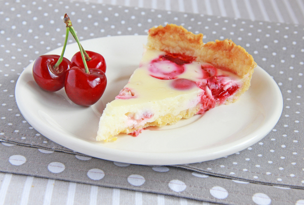 4. Тесто раскатать и поместить в форму (можно просто распределить его руками). Равномерно разложить сверху ягоды, залить сметанной смесью.