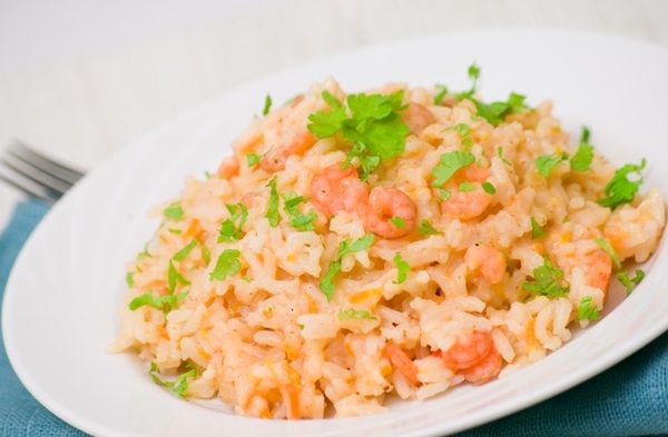 5. Когда рис будет почти готов, добавить сливки. Перемешать и варить 5 минут. Добавить креветки и тертый пармезан, перемешать и готовить еще 1 минуту. Разложить готовое ризотто по тарелкам, украсить зеленью и подать к столу.