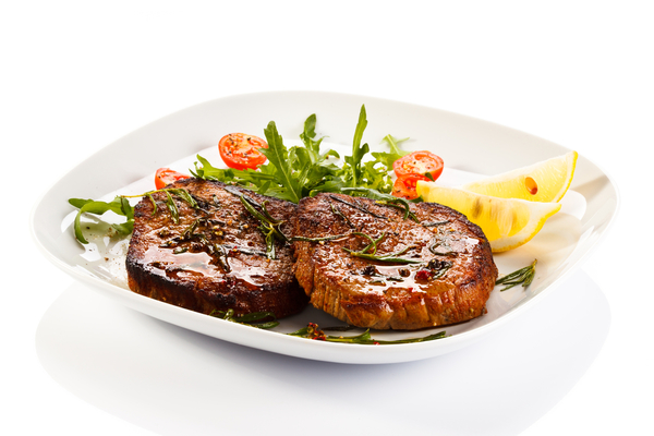 2. Жарить бифштекс на гриле, один раз перевернув в процессе жарки. Перед подачей выложить на блюдо листья салата, поверх листьев выложить мясо. Украсить помидорами черри и ломтиками лимона.