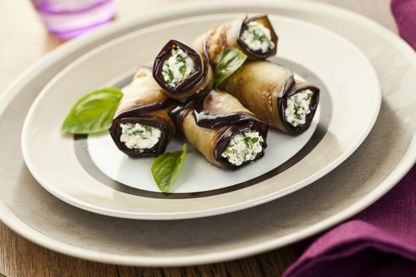 4. На готовые баклажаны выложить творожную смесь, свернуть рулетиками. Подавать, украсив свежей зеленью.