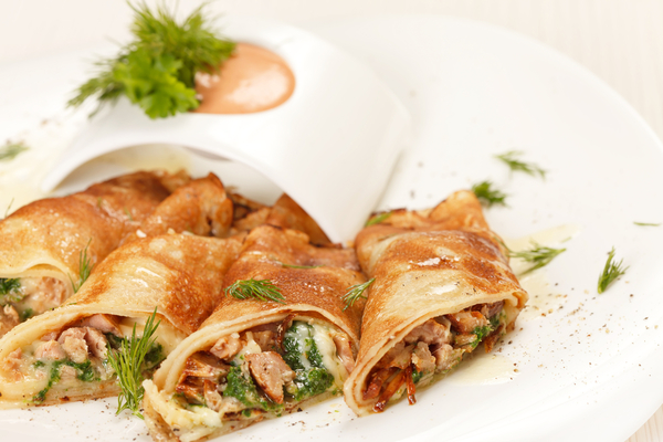 5. Завернуть начинку в блины и украсить блюдо рубленой зеленью.