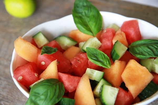 Рецепт освежающего салата из дыни, арбуза и огурцов с острой лимонной заправкой
