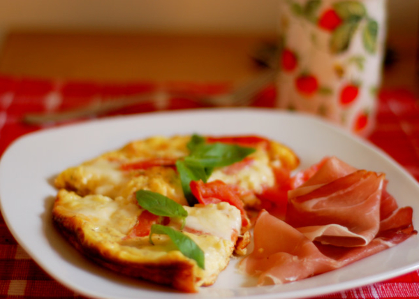 Сытный и вкусный завтрак: омлет с помидорами, моцареллой и соусом песто