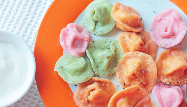 2. Приготовить три вида теста для пельменей: зеленое, оранжевое и красное. Для этого взбитое яйцо разделить на 3 части, и в каждую добавить разноцветный сок. Постепенно добавляя муку, замесить крутое тесто, накрыть пленкой и дать постоять 30 минут.