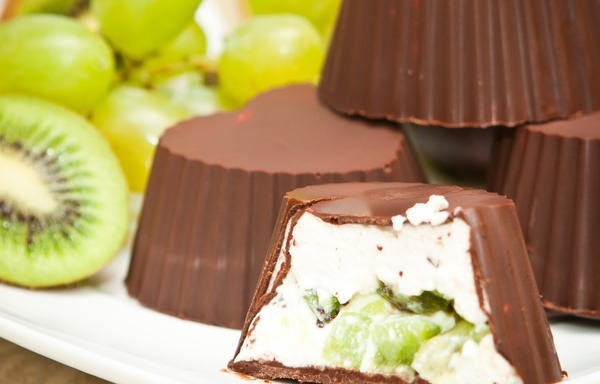 4. Уложить в формочки слоями творожную массу и фрукты, полить шоколадом. Отправить в морозильную камеру до застывания шоколада (примерно 20-30 минут).