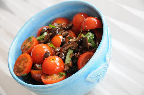 Томатный салат с оливками и базиликом прекрасно оттенит вкус запеченного мяса