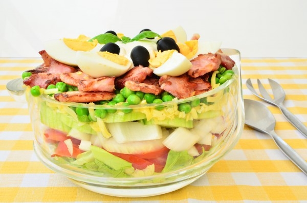 Готовим красивый праздничный салат из овощей, яиц и бекона