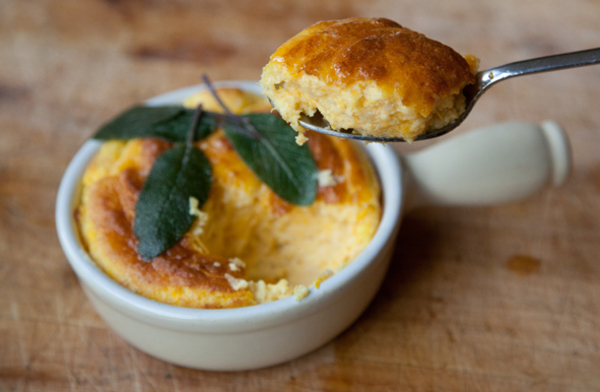 3. Растопить в сотейнике сливочное масло, всыпать просеянную муку. Прогреть, помешивая и снять с огня. Не прекращая помешивать, влить теплое молоко. Добавить желтки, каждый раз помешивая. Прибавить тыквенное пюре, слегка остудить.
