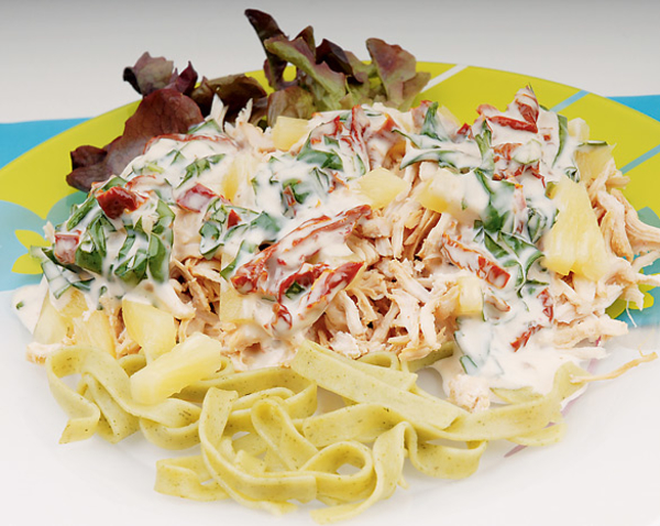 3. Филе выложить на листья салата, посыпать измельченным ананасом и полить соусом. В качестве гарнира подать отварную пасту.
