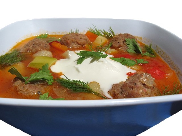 6. Хлеб замочить, отжать, смешать с фаршем, яйцом, солью и перцем. Сделать маленькие фрикадельки и обжарить их со всех сторон. Добавить их в суп и варить 5 минут.