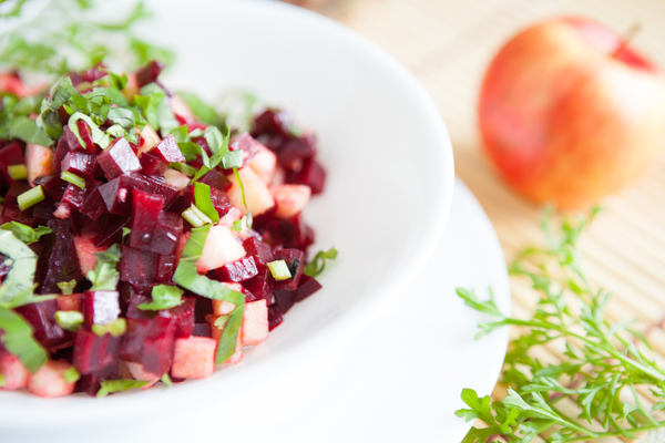 5. Перемешать свеклу и яблоки, полить заправкой и посыпать рубленым луком.