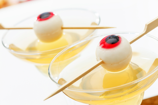 3. Конфеты в виде глаз наколоть на шпажки и украсить желе.