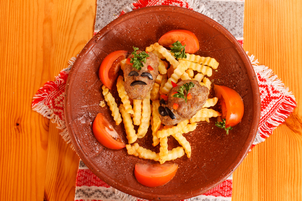 4. Выложить картофель и котлеты на тарелку. Сделать лица монстров из веточек зелени, кусочков маслин и томатов.