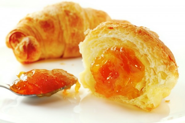 3. Охлажденное тесто разделить на 2 части. Каждую раскатать в тонкий круг и разрезать на сектора. На широкую часть каждого куска теста выложить немного джема и свернуть рулетом, начиная с широкой стороны. Смазать взбитым яйцом.