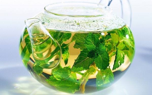 4. Перед подачей в каждый стакан положить по веточке мяты и налить горячий чай. Сахар-рафинад подать отдельно.