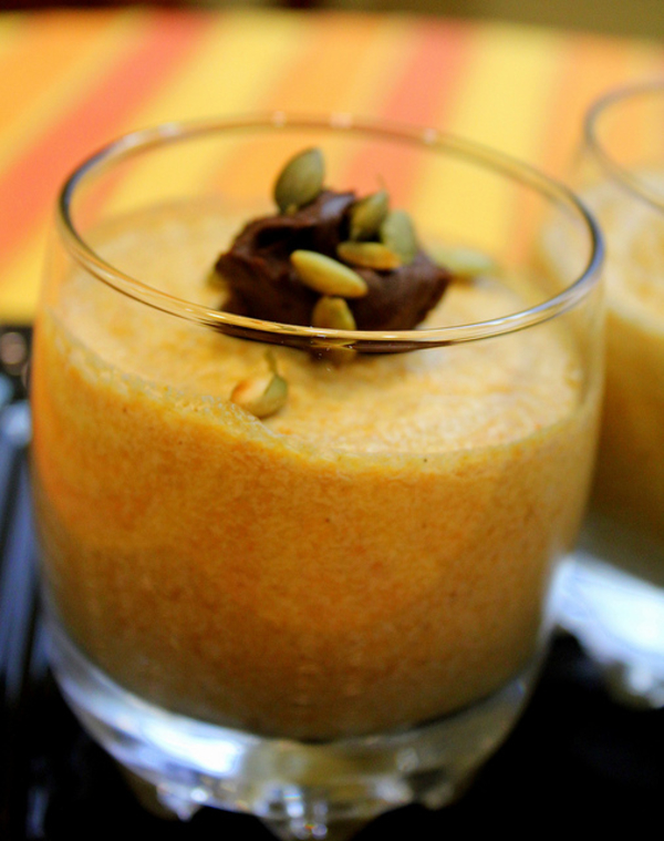 2. Взбить остатки сливок, добавить тыквенное пюре и хорошо перемешать. Выложить готовый мусс в креманки.