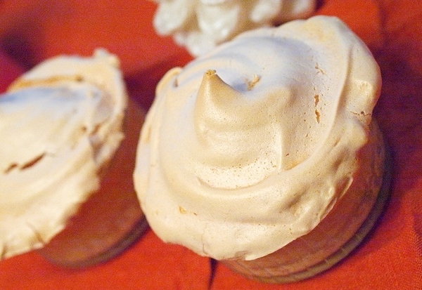 3. Белки взбить с сахарной пудрой в стойкую, крепкую пену. Вынуть формочки из духовки, дать постоять 2-3 минуты. Выложить на мусс взбитые белки. С противня слить воду, снова поставить на него формочки, поместить в духовку и готовить еще 30-40 минут, пока меренги не подрумянятся. Оставить десерт в духовке с приоткрытой дверцей на 10-15 минут и подать к столу.
