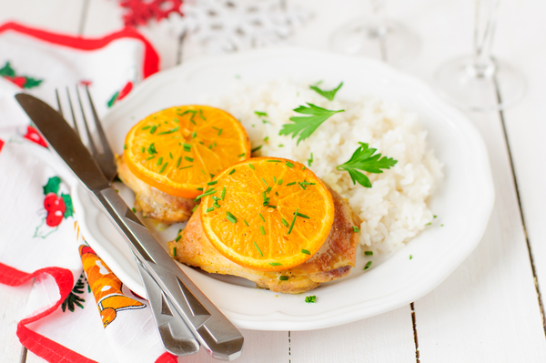 4. Тонко нарезать апельсины и положить сверху на кусочки курицы.