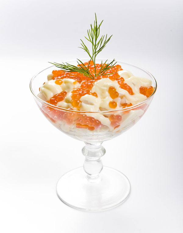 Этот салат пленит нежным вкусом морепродуктов. Бело-красно-розовая цветовая гамма, порционная подача – все, чтобы гости запомнили праздничный ужин надолго.