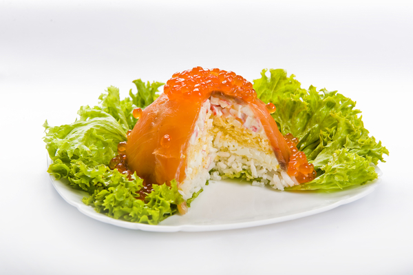 2. Теперь укладываем слоями все ингредиенты, смазывая слои майонезом. Последовательность произвольная. Когда салатник наполнен, нужно перевернуть его на праздничное блюдо, как пасху. Сверху положить несколько ложек красной икры. Готово!