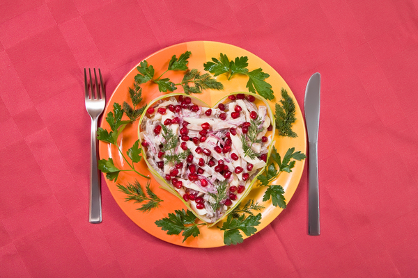 6. Выложить салат в виде сердца, украсить листьями пекинской капустой, зернами граната и веточками зелени.