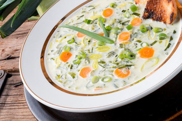 Рецепт вегетарианского супа с плавленым сыром, морковью и луком-пореем.
