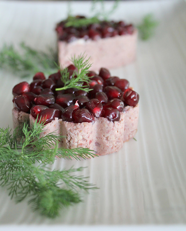 3. Добавить соль и перец по вкусу, перемешать. Переложить паштет на тарелку, украсить зернами граната и веточками укропа.