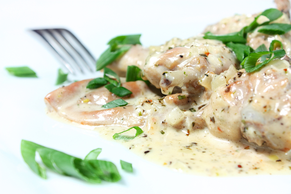 5. Добавить сметану, перемешать и довести до кипения. Снять с огня и подавать с картофельным пюре.