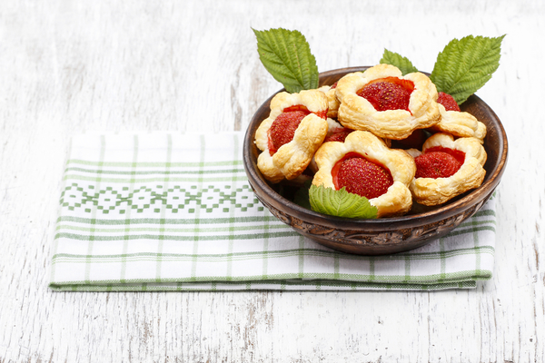 2. С помощью формочек для печенья вырезать цветочки, в центре сделать углубление и положить внутрь ягоду клубники из варенья. Можно использовать замороженную клубнику, ее нужно будет присыпать сахаром.
