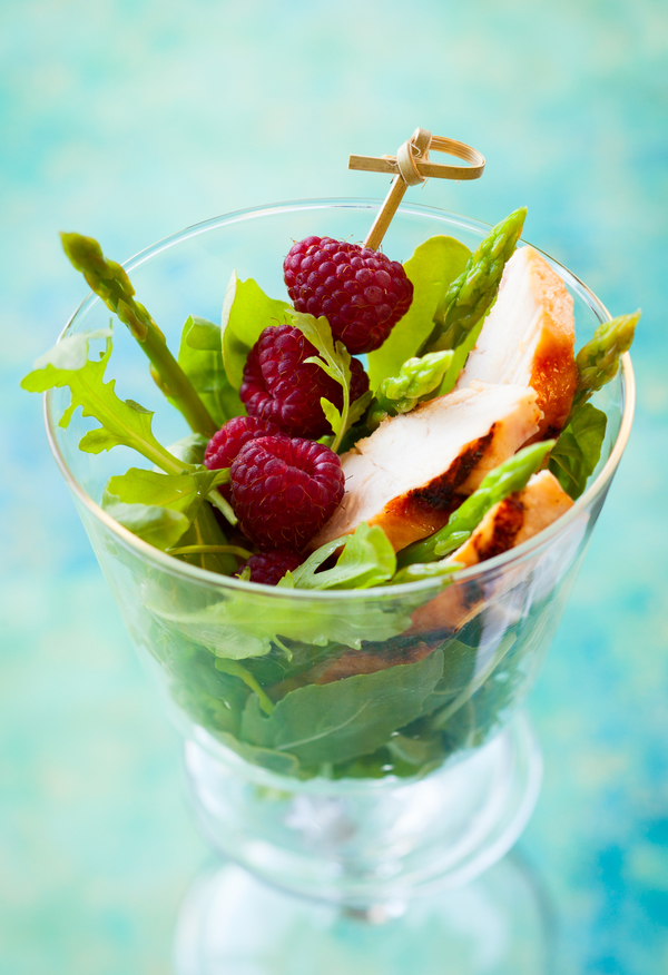 Легкий салат из запеченного куриного филе, зелени и малины.