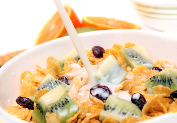 Готовый сухой завтрак станет полезней, если добавить натуральный йогурт, фрукты и сушеные ягоды.