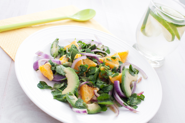 В этом легком салате удачно сочетаются апельсины, авокадо и красный лук.