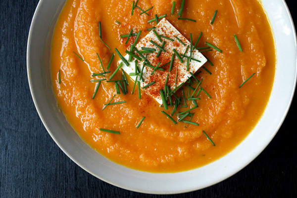 Рецепт постного супа из моркови с чесноком, имбирем и соевым сыром тофу.