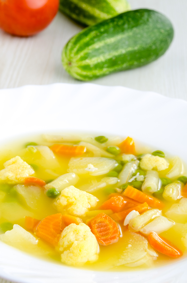 Рецепт горячего постного супа из белой спаржи, картофеля, цветной капусты, моркови и зеленого горошка.