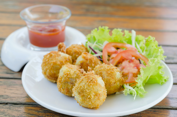 Картофельные крокеты с сыром идеально сочетаются с овощным салатом и томатным соусом