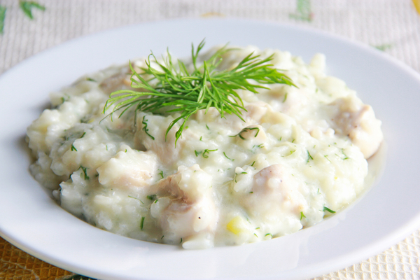 5. Когда рис будет почти готов, влить сливки, добавить тертый сыр и рубленый укроп. Приправить по вкусу и готовить ризотто еще 3 минуты. Подавать горячим.