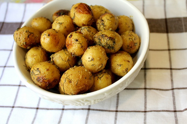 2. Перемешать рубленый укроп, горчицу, соль, белое вино и раздавленный чеснок. Смазать полученной смесь картофель.